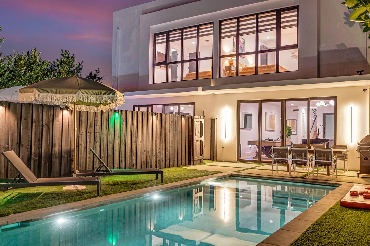 Welcome to Miami's ultra-modern luxury villa in the vibrant Design District/Wynwood area! Newly built, this stunning home offers 6 spacious bedrooms, 4 full & 2 half bathrooms, 2 stylish living rooms, and 2 fully equipped kitchens. Enjoy resort-like amenities: two private pools, two fire pits, mini golf, giant chess, cornhole, foosball, billiards, and two lush private backyards. Perfectly located near Miami Beach, Midtown, Wynwood, and Brickell. Your ultimate Miami getaway awaits!
