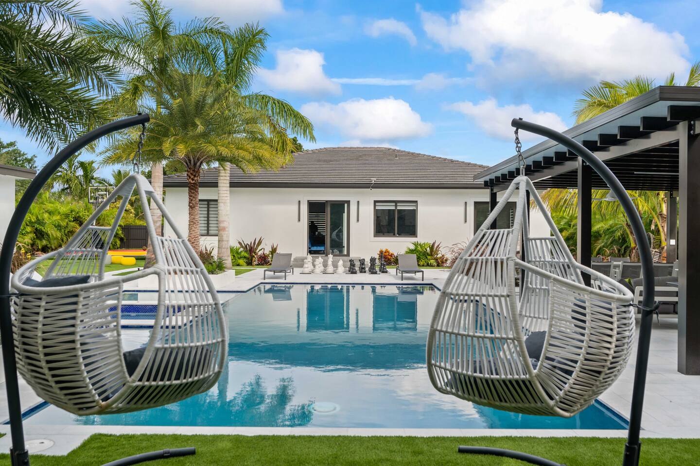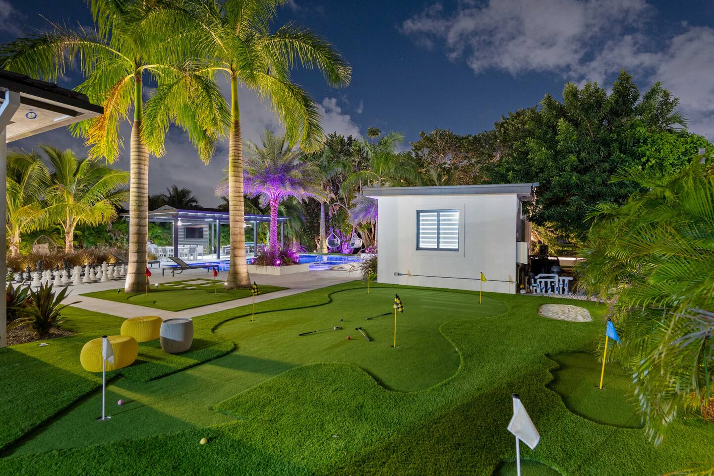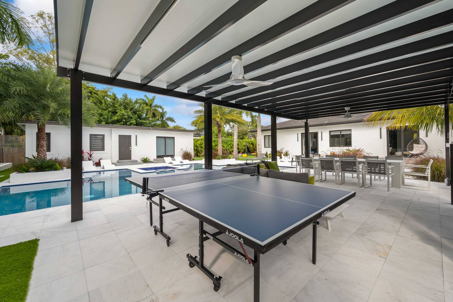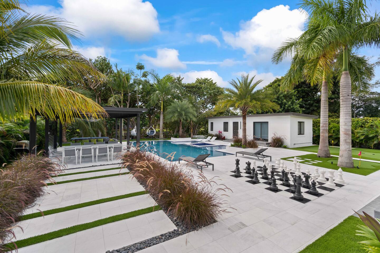 • 30 minutes to South Beach or Brickell • 20 minutes to Miami International & Fort Lauderdale Airports • 15 minutes to Wynwood & Design District • 10 minutes to Oleta River Park & Haulover Park • 10 minutes to Hard Rock Stadium 🚫 Parties & Noise • No parties, receptions, or events allowed 🔕 . Violations result in immediate termination • Quiet hours start at 10 PM • No Smoking: Prohibited indoors, near mini golf and outdoor furniture. Penalty 🚭 $5,000 🛌 Sleep Main House • Room 1: 1 King Bed • Room 2: 1 Queen Bed • Room 3: 1 Queen Bed • Room 4: 1 Queen Bed • Room 5: 1 Queen Bed • Common Area: 2 Twin Rollaway Beds Detached Guest House • Room 6: 2 Queen Bed • Room 7: 2 Queen Bed Smart TV and a complete linen set in each bedroom 🛁 4 Bathrooms - each stocked with: • Shampoo, conditioner, body wash • Towels and washcloths • Hairdryer • Beach and pool towels 🍽 Kitchen & Dining • Fully equipped kitchen • Modern appliances, including a drip coffee maker & a blender • Indoor dining table for 8 guests, plus additional outdoor dining areas 🧺 Laundry • Washer & dryer with detergent 🌴 Outdoor Amenities • Heated Pool & Jacuzzi (4hr notice required for preheat) • Basketball hoop, shuffleboard, mini golf, bocce, chessboard, and cornhole • Chaise lounges, covered patio • Canal views and shaded sitting areas 🐾 Pet Policy • Pets are allowed with prior approval • Additional $150 cleaning fee 📺 Entertainment & Connectivity • All TVs are Smart with streaming access • High-speed Wi-Fi throughout 1000MBPS 📋 Important Notes • Check-in: 4:00 PM | Check-out: 10:00 AM • Jacuzzi: (On request ) • Surveillance: Entry/exit points only (no indoor cameras) 🧹 Services & Maintenance • Landscaping: Weekly (Wednesdays/Thursdays) • Pool Service: Weekly (Wednesdays/Thursdays) • Garbage Collection: Mondays & Thursdays 🚗 Getting Around • Uber or by car. The property offers 4-car gated driveway parking (no street parking permitted).