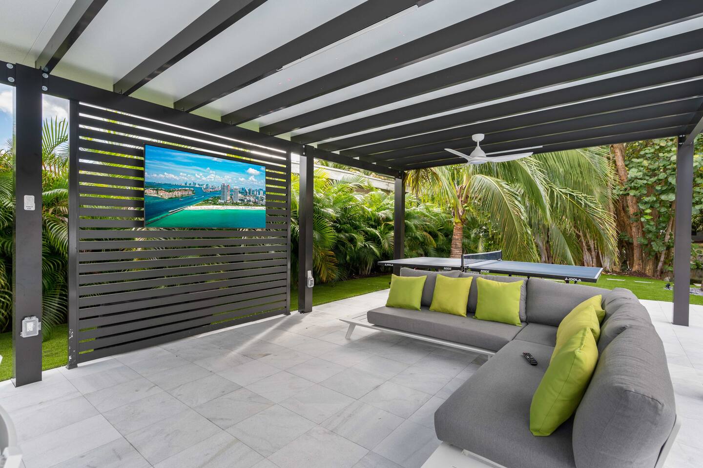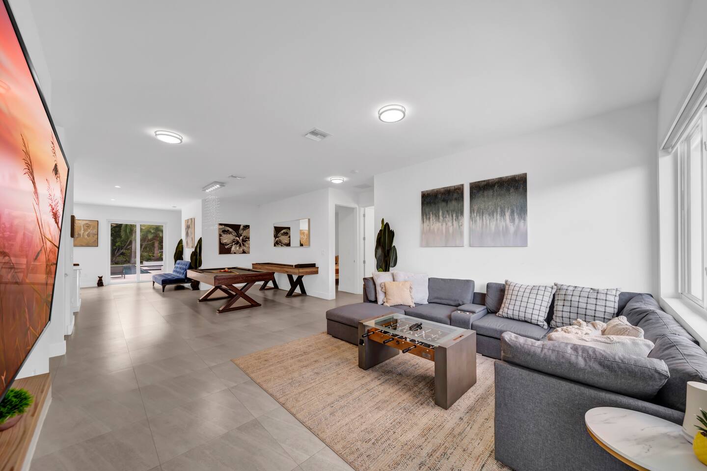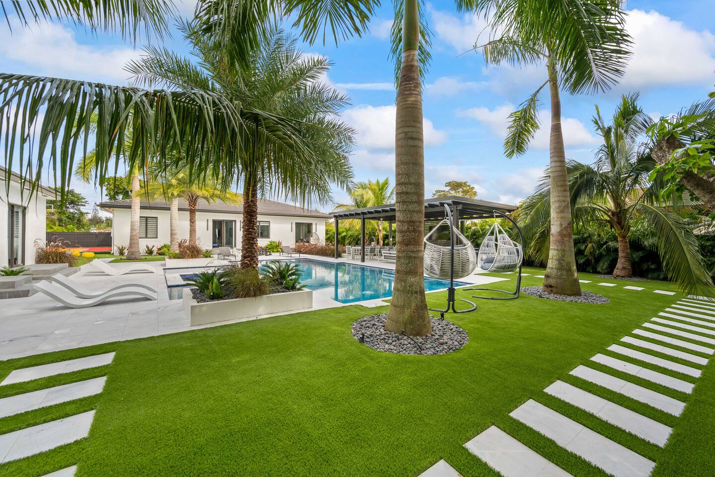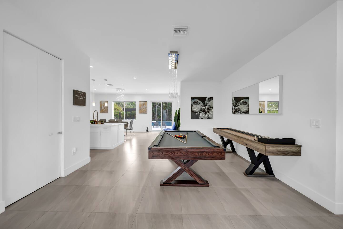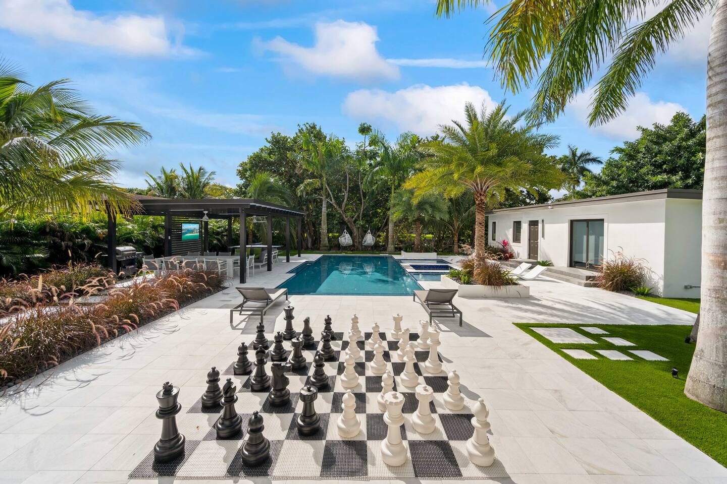 • 30 minutes to South Beach or Brickell • 20 minutes to Miami International & Fort Lauderdale Airports • 15 minutes to Wynwood & Design District • 10 minutes to Oleta River Park & Haulover Park • 10 minutes to Hard Rock Stadium 🚫 Parties & Noise • No parties, receptions, or events allowed 🔕 . Violations result in immediate termination • Quiet hours start at 10 PM • No Smoking: Prohibited indoors, near mini golf and outdoor furniture. Penalty 🚭 $5,000 🛌 Sleep Main House • Room 1: 1 King Bed • Room 2: 1 Queen Bed • Room 3: 1 Queen Bed • Room 4: 1 Queen Bed • Room 5: 1 Queen Bed • Common Area: 2 Twin Rollaway Beds Detached Guest House • Room 6: 2 Queen Bed • Room 7: 2 Queen Bed Smart TV and a complete linen set in each bedroom 🛁 4 Bathrooms - each stocked with: • Shampoo, conditioner, body wash • Towels and washcloths • Hairdryer • Beach and pool towels 🍽 Kitchen & Dining • Fully equipped kitchen • Modern appliances, including a drip coffee maker & a blender • Indoor dining table for 8 guests, plus additional outdoor dining areas 🧺 Laundry • Washer & dryer with detergent 🌴 Outdoor Amenities • Heated Pool & Jacuzzi (4hr notice required for preheat) • Basketball hoop, shuffleboard, mini golf, bocce, chessboard, and cornhole • Chaise lounges, covered patio • Canal views and shaded sitting areas 🐾 Pet Policy • Pets are allowed with prior approval • Additional $150 cleaning fee 📺 Entertainment & Connectivity • All TVs are Smart with streaming access • High-speed Wi-Fi throughout 1000MBPS 📋 Important Notes • Check-in: 4:00 PM | Check-out: 10:00 AM • Jacuzzi: (On request ) • Surveillance: Entry/exit points only (no indoor cameras) 🧹 Services & Maintenance • Landscaping: Weekly (Wednesdays/Thursdays) • Pool Service: Weekly (Wednesdays/Thursdays) • Garbage Collection: Mondays & Thursdays 🚗 Getting Around • Uber or by car. The property offers 4-car gated driveway parking (no street parking permitted).