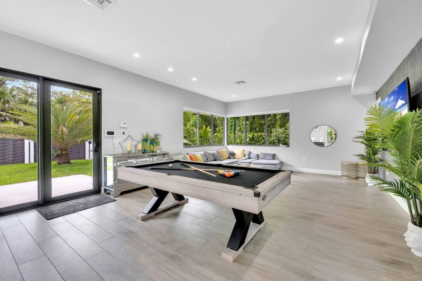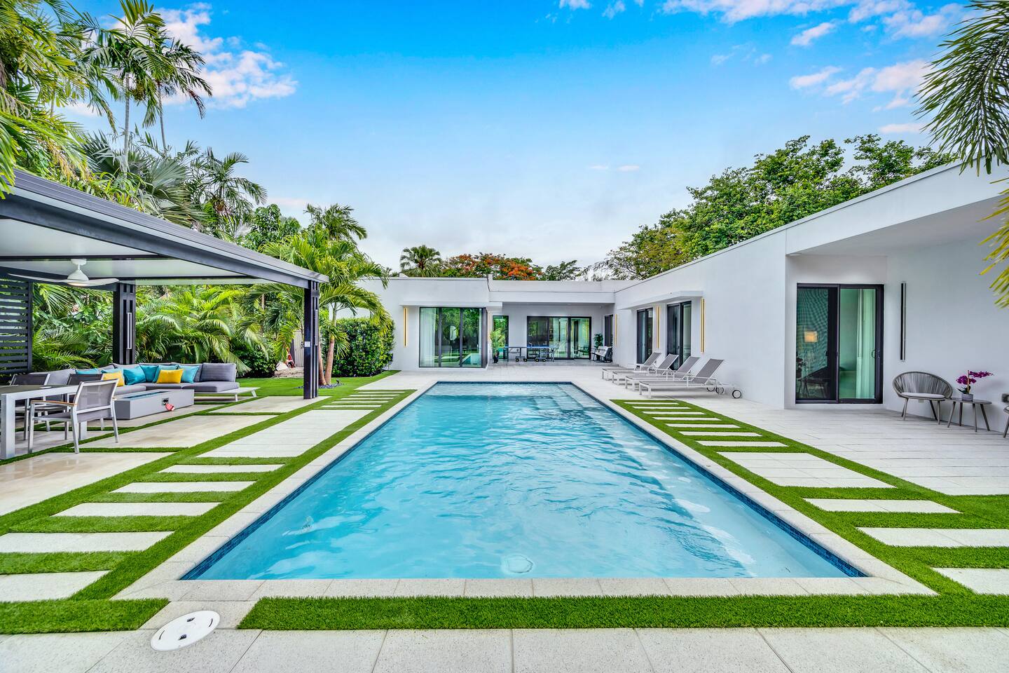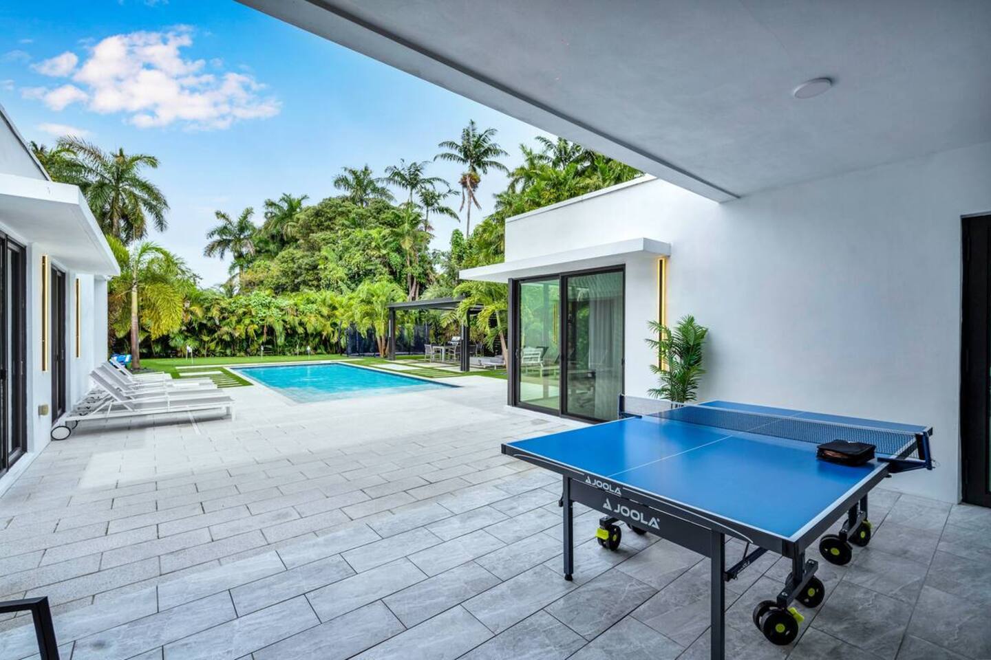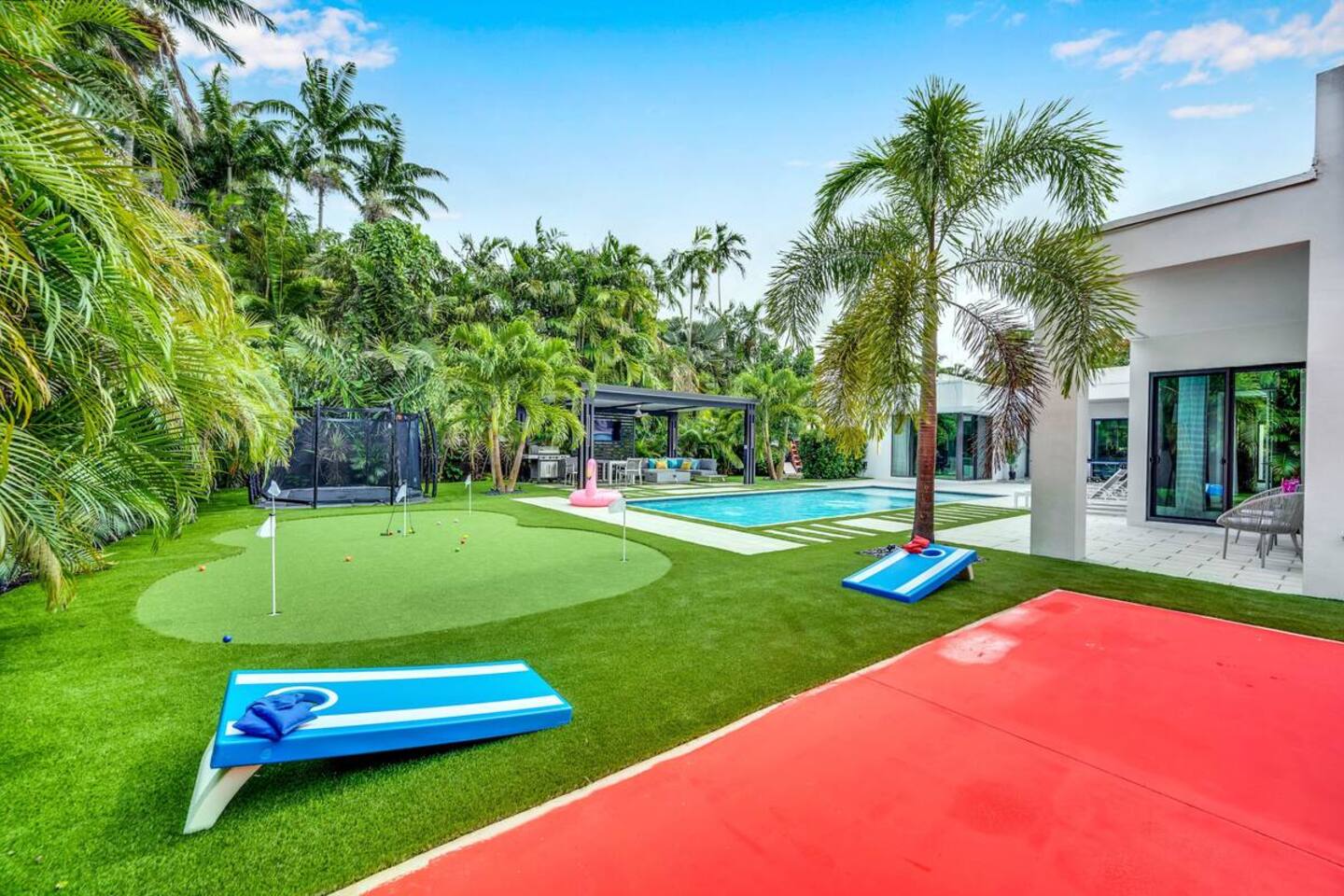 • 25 minutes to South Beach or Brickell • 20 minutes to Miami International & Fort Lauderdale Airports • 15 minutes to Wynwood & Design District • 10 minutes to Oleta River Park & Haulover Park • 10 minutes to Hard Rock Stadium 🛌 Sleep • Room 1: 1 King Bed • Room 2: 1 King Bed • Room 3: 1 Queen Bed • Room 4: 2 Single Beds • Common Area: 2 Twin Rollaway Beds Smart TV and a complete linen set in each bedroom 🛁 3.5 Bathrooms - each stocked with: • Shampoo, conditioner, body wash • Towels and washcloths • Hairdryer • Beach and pool towels 🍽 Kitchen & Dining • Fully equipped kitchen • Modern appliances, including a drip coffee maker & a blender • Indoor dining table for 6 guests, plus additional outdoor dining areas 🧺 Laundry • Washer & dryer with detergent 🌴 Outdoor Amenities • Heated Pool (4-hour notice required for preheat) • Basketball hoop, shuffleboard, mini golf • Chaise lounges, covered patio • Fireplace 🚫 Parties & Noise • No parties, receptions, or events allowed • Quiet hours start at 10 PM • Violations may result in immediate termination and fines 🐾 Pet Policy • Pets are allowed with approval • Additional $85 cleaning fee 📺 Entertainment & Connectivity • All TVs are Smart with streaming access • High-speed Wi-Fi throughout 1000MBPS 📋 Important Notes • Check-in: 4:00 PM | Check-out: 10:00 AM • Surveillance: Entry/exit points only (no indoor cameras) 🧹 Services & Maintenance • Landscaping: Weekly (Wednesdays/Thursdays) • Pool Service: Weekly (Wednesdays/Thursdays) • Garbage Collection: Mondays & Thursdays 🚗 Getting Around • Uber or by car. The property offers 4-car private driveway parking (no street parking permitted). Guest access