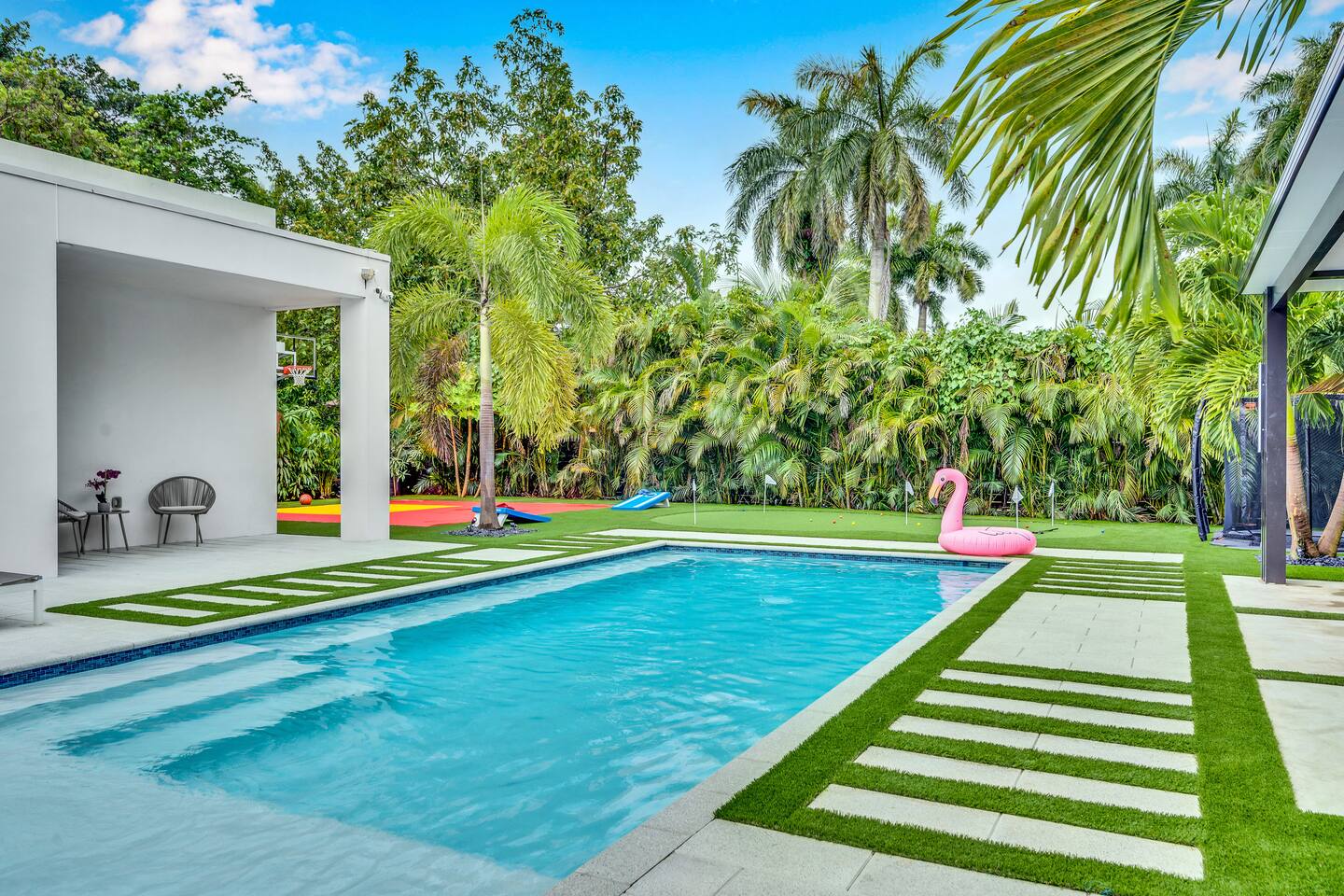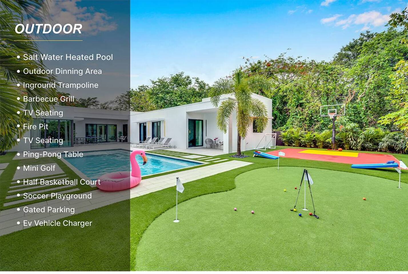 Dear Guests, Welcome to a Private 4-bedroom heated saltwater pool villa. It features a heated pool, a BBQ, a basketball court, various outdoor games, and a lush green yard perfect for entertaining. It’s a great place for family getaways or group stays, offering spacious amenities in a private setting.